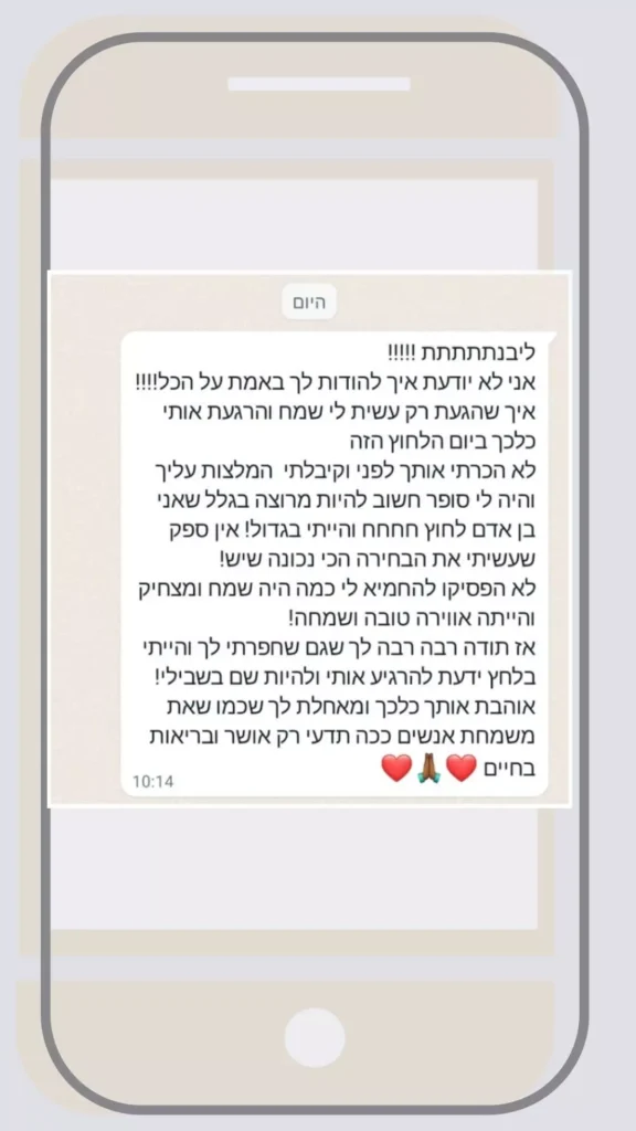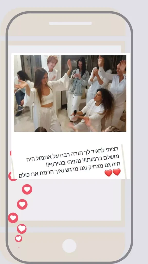 הקטע הזה הוא סופר זכיר ואהוב על ידי המשתתפות, יש להן סוף סוף הזדמנות חד פעמית לעצור שניה ממרוץ החיים ולהתרכז בעצמן… הכל בזכות המתנה שאת נתת להן בערב המיוחד שלך.